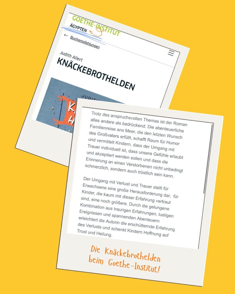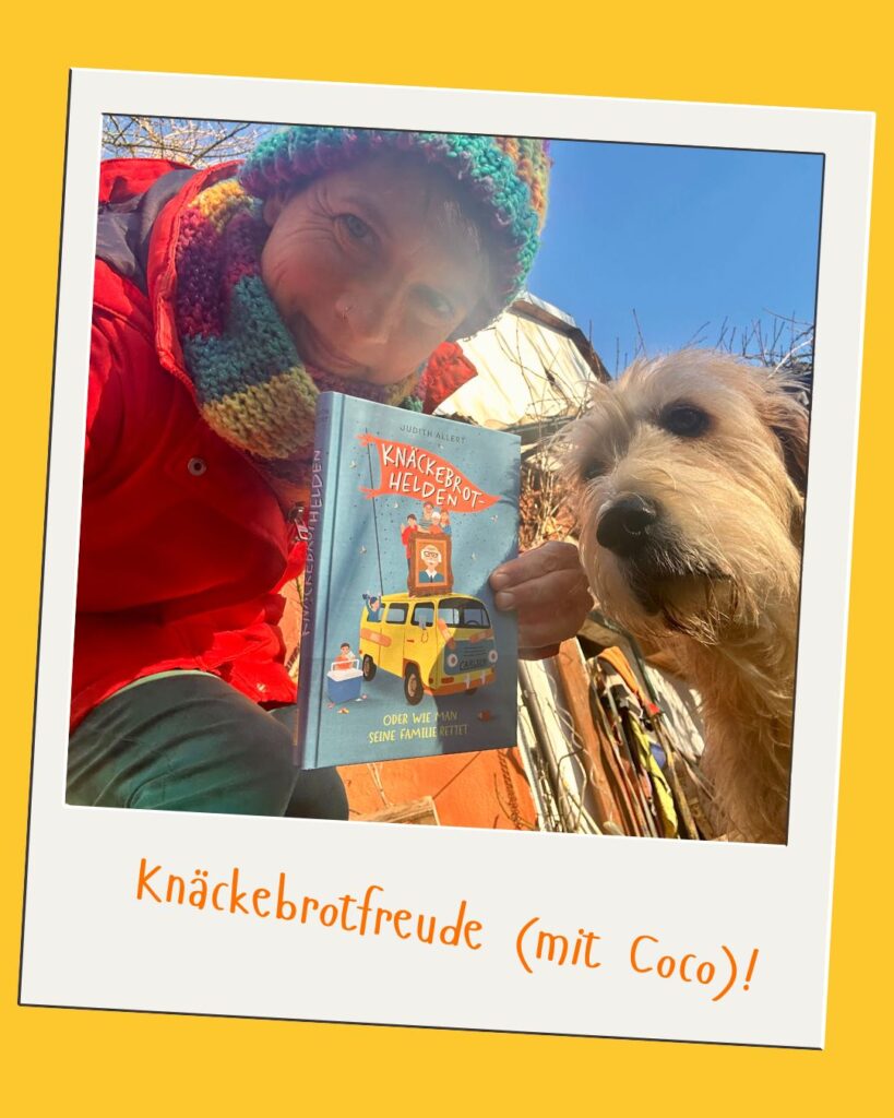 Heute erlaub ich mir, mich mit Coco (und am Liebsten natürlich auch mit euch) nochmal über meine „Knäckebrothelden“ zu freuen. Wer hier regelmäßig mitliest, weiß vielleicht, dass das Buch für mich was Besonderes ist. Ich nenn es für mich mein „Papa-Buch“ – der Stups zum Schreiben war der Tod meines Vaters (vor mittlerweile fast sechs Jahren, verrückt …) und der Wunsch, als kunterbunte Optimistin, aus dem traurigen Thema Abschied, irgendwie was Positives rauszuholen. Im Leben – und als Buch. Und zwar in Form eines durchaus lustigen, mutmachenden Roadtrips – mit viel Herz, Humor und Zusammenhalt. Tja und nun ist das Buch schon eine ganze Weile draußen und ich bin wirklich glücklich, dass ich damit einige, kleine Erfolge feiern durfte: Schöne Rezensionen, berührende Lesungen (aber nie todtraurig!). Eine Besprechung im Radio. Eine Empfehlung beim Goethe-Institut Ägypten (inklusive Empfehlung einer Übersetzung ins Arabische). Einer Auslands-Lizenz nach Rumänien! Ja und dann sind vor Kurzem auch noch die Belegexemplare für die zweite Auflage auf den Hof geflattert. Und dass mein Buch also nicht nur empfohlen, sondern anscheinend wirklich gelesen wird, freut mich (und Coco) natürlich ganz besonders!