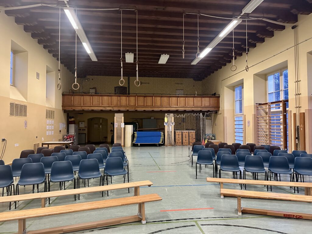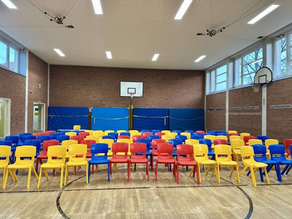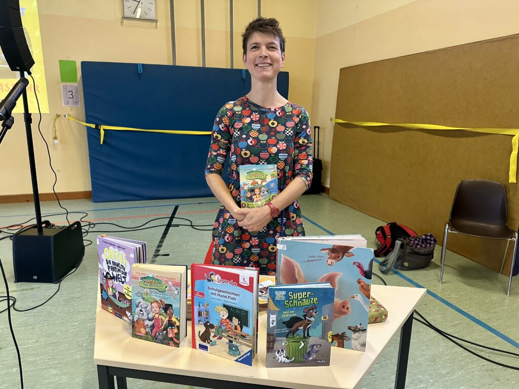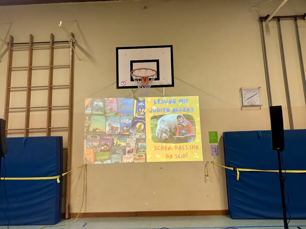 Und wie ihr an den Fotos auch seht – Kinderbuchschreibende halten sich auf Lesereisen manchmal beinahe genauso oft in Turnhallen auf wie Sportlehrkräfte.