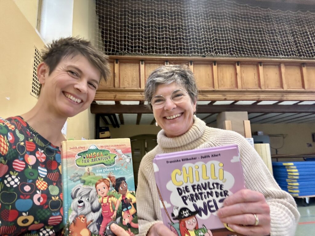Ihr seht hier eine glückliche Autorin mitsamt glücklicher Buchhändlerin am (nicht im Bild, müsst ihr so glauben ) bis auf zwei Bücher leergekauften Büchertisch! Achja, an so nette Begleitung auf Lesereisen könnte ich mich gewöhnen. Die zauberhafte Doris Müller-Höreth von der Buchhandlung Pelzner hatte mich für Lesungen an der Grundschule Nürnberg-Eibach geladen und ich bin zwei Tage lang mit vielen, vielen Erst- und Zweitklässler nach Bad Brausewind gereist. Wir haben mit der faulsten Piratin der Welt in der Hängematte geschmökert und wilde Seeungeheuer „umgeschult“. Und für die anderen Klassen waren supertolle Kolleginnen da (leider nur nicht mit mir gleichzeitig) – Silke Schlichtman und Jutta Richter.
