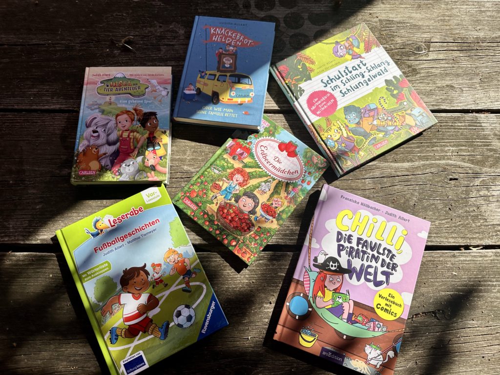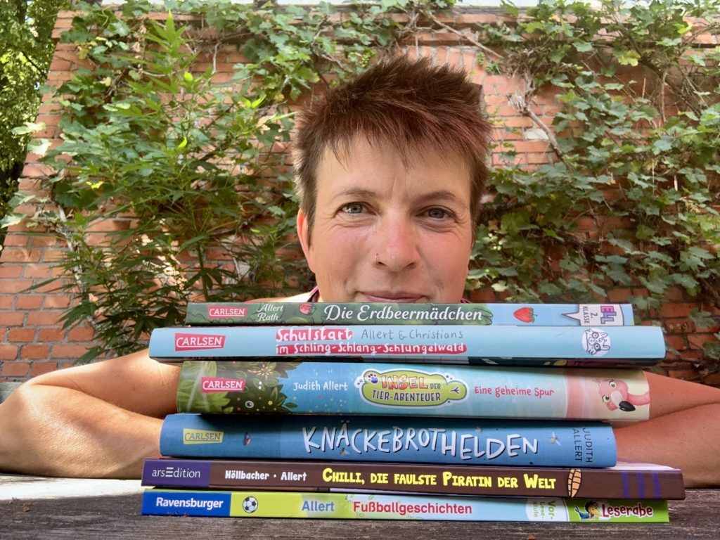Ihr seht hier eine ziemlich dankbare und glückliche Kinderbuchautorin vor einem Stapel wunderschöner Bücher – meine „Ernte“ aus dem diesjährigen Frühjahrsprogramm. Wäre der Stapel kleiner, wäre ich aber genauso dankbar und glücklich! (Das war ja auch irgendwie fast ein Versehen. Der ein Verlag plant kurzfristig, der andere langfristig, dann kommt da das dazwischen, dafür geht es da schneller. Und plötzlich reicht der Stapel fast bis zur Nase!) Auf jeden Fall weiß ich sehr zu schätzen, so nen tollen Beruf ausüben zu dürfen. Klar, immer mal wieder mit so einigen Herausforderungen. Aber hey, ich darf mir ständig lustige (und auch spannende und auch mal ein bisschen traurige) Geschichten ausdenken! Und die gehen IMMER gut aus. Weil ich das so will natürlich – aber auch weil ich so schlaue und liebenswerte Protagonist:innen habe, die einfach wissen: Zusammen wird’s bunter und zusammen schafft man alles! Ich darf Kindern Mut machen, ihnen zeigen, wie wichtig Fantasie ist. Was man alles erreichen kann, obwohl (oder weil) man noch klein ist. Ich erzähl davon, wie toll die Natur ist und dass wir alle Erdlinge sind – und wir Menschen auch nur Tiere (wenn auch oft nicht die Schlauesten). Das macht auf allerlei Art die vielseitigen Herausforderungen auf dem Planeten erträglicher, finde ich. Für mich – und hoffentlich auch mindestens ein bisschen für meine Leserinnen und Leser!