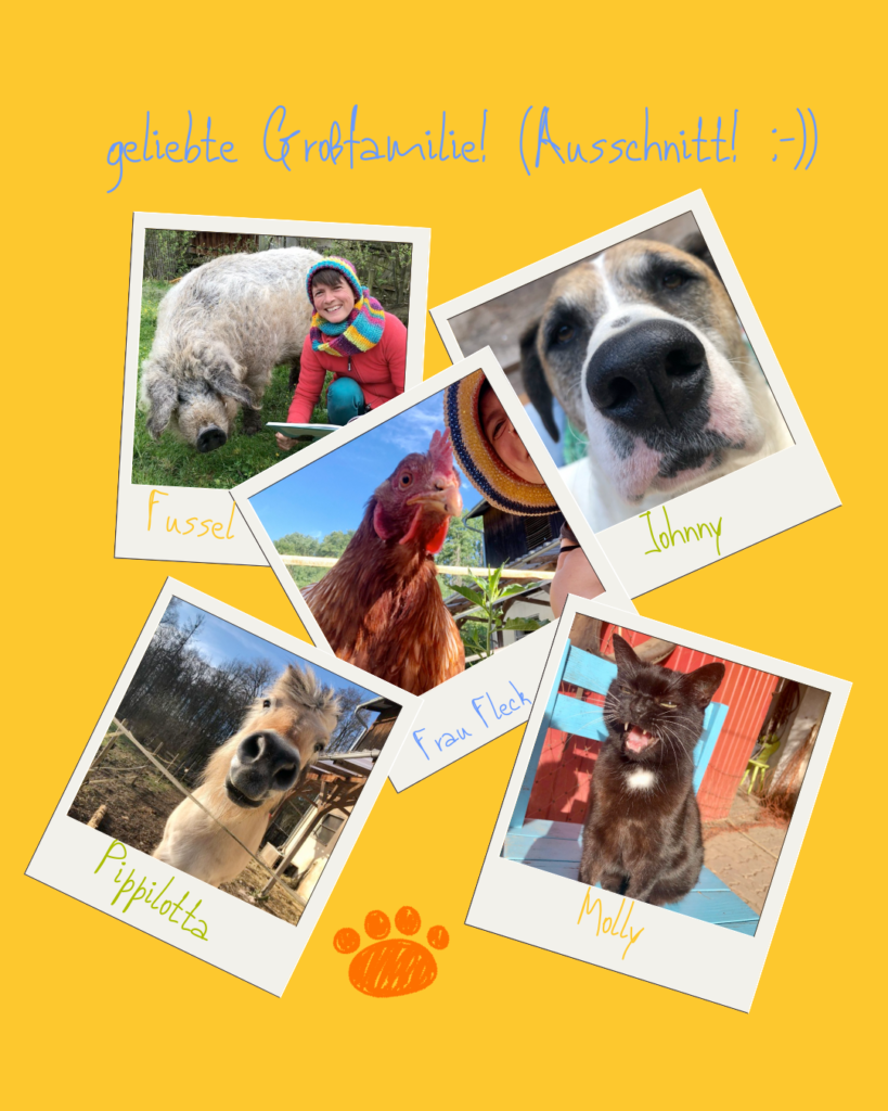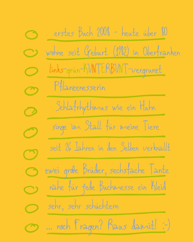 Meine Großfamilie besteht aus Hunden, Katzen, Pferden, Hühner, Wollschweinen und einem Ehemann. Außerdem bin ich stolze Tante (sechsfach). Ich habe, wohnorttechnisch, Oberfranken noch nie verlassen. Mein Hof ist neun Kilometer von meinem Heimatort weg. Ich bin absolute Frühaufsteherin. Abends könnte ich NIE arbeiten.