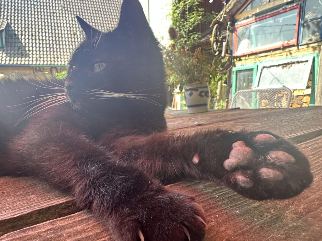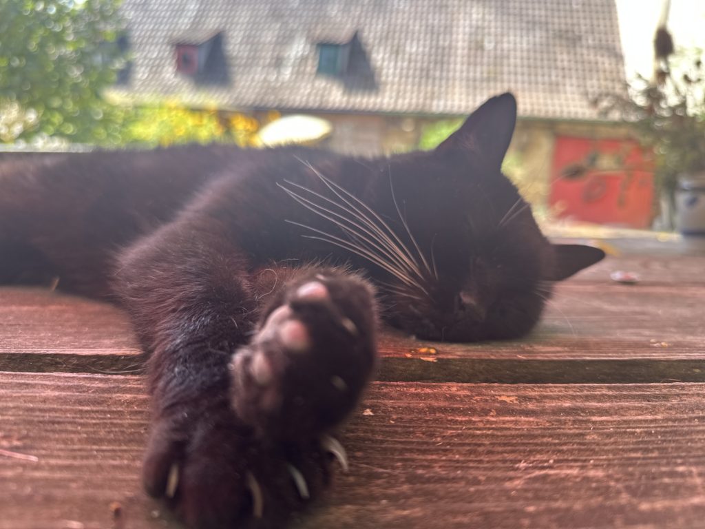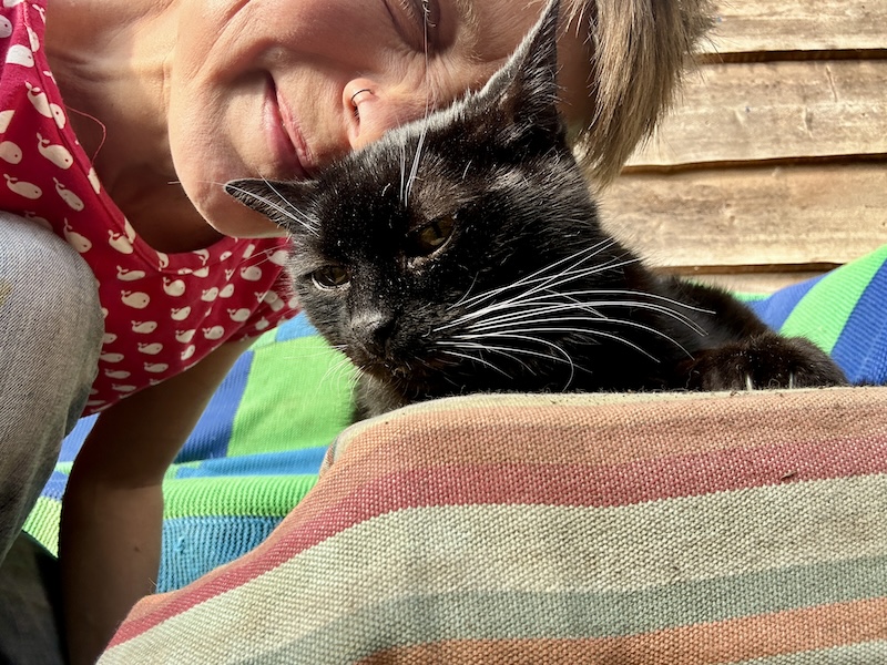 Bild 4: Bröselchen (Die ist im Winter bei den Schweinen eingezogen, nachdem wir sie schon vor drei Jahren kennen gelernt haben. Da lag sie mit vier Babys im Schweinegehege und wir haben sie kastrieren lassen und zwei Babys vermittelt (die anderen haben wir nicht erwischt). Dann war sie erstmal jahrelang beleidigt und plötzlich war sie zurück! Anfangs war sie sehr, sehr scheu. Ich hab sie monatelange nur Miezibitzi genannt, weil ich ihr keinen richtigen Namen geben wollte, in der Angst, dass sie wieder auszieht. Aber anscheinend bleibt sie (und scheu ist sie auch nicht mehr). Und weil sie sich so gut mit Krümel & Fussel versteht hat sich nach langem Hin- und Her nun endlich Bröselchen als perfekter Name herauskristallisiert. Unsere anderen beiden Katzen sind leider (noch) nicht begeistert – aber zumindest gibt es keine Kämpfe mehr. Mal sehen, ob irgendwann Freundschaft draus wird …)
