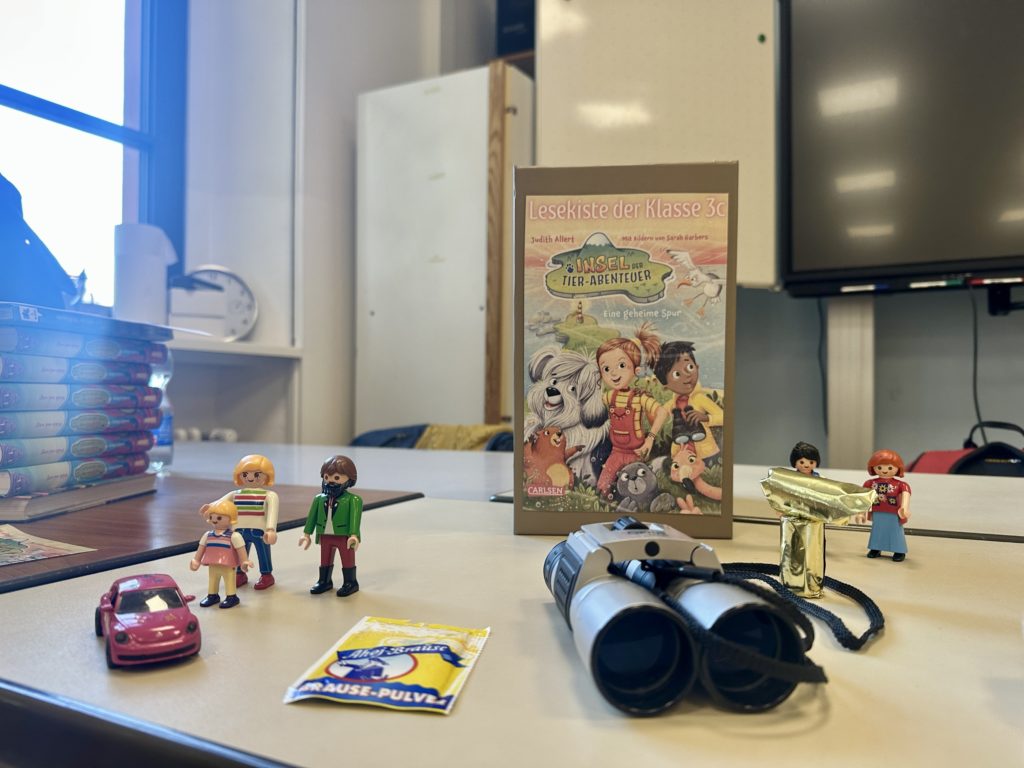 Letzte Woche war ich an einer Grundschule in Kaiserslautern eingeladen. Nicht gerade um die Ecke. Aber da MUSSTE ich einfach hin. Eine der jetzigen dritten Klassen hat nämlich letztes Schuljahr den ersten Band der „Insel der Tierabenteuer“ (geschrieben von mir illustriert von der großartigen Sarah Garbers) gelesen. Vor der Lesung haben ein paar Kinder den anderen erzählt, was passiert ist (natürlich ohne das Ende zu verraten). Geholfen hat ihnen dabei ihre Lesekiste – siehe Foto. Darin waren einige wichtige, brausewindige Erinnerungsstücke drin. Aber nicht nur das, sondern auch die Lesungen (aus dem zweiten Band der Reihe) waren etwas besonderes. Weil die Kinder besonders begeistert waren und das obwohl – oder gerade auch weil? – einige darunter gewesen sind, die noch gar nicht gut oder fast gar kein Deutsch sprechen konnten. Kinder, denen zuhause teilweise nie vorgelesen wird. Kinder, von denen manche zuvor noch nie ein eigenes Buch besessen hatten! Umso wertvoller war die gemeinsame (Vor-)Lesezeit in der Schule. Und dass ich dann noch kommen durfte und wir uns alle kennen gelernt haben und über die Geschichte und über das Geschichtenerfinden plaudern konnten, war schließlich das Sojasahnehäubchen.