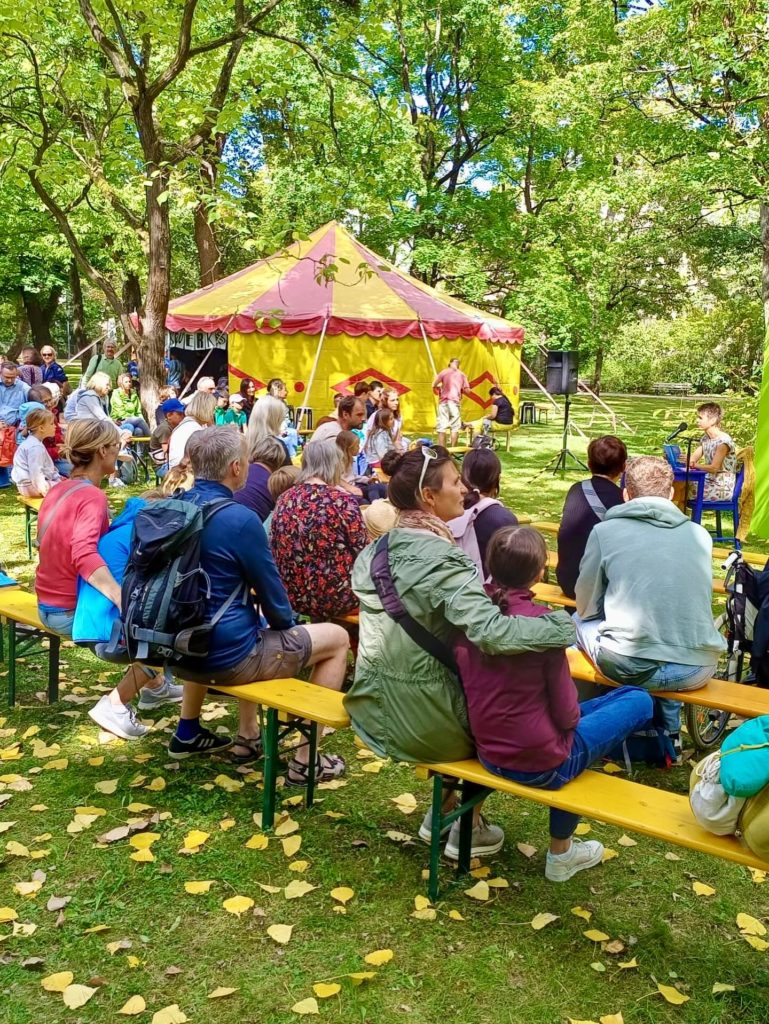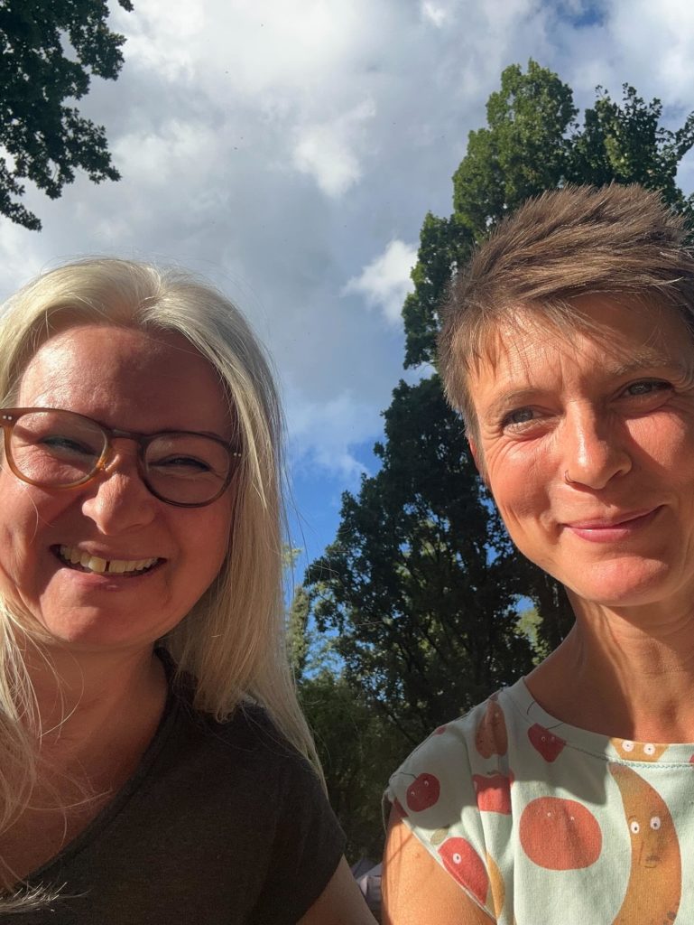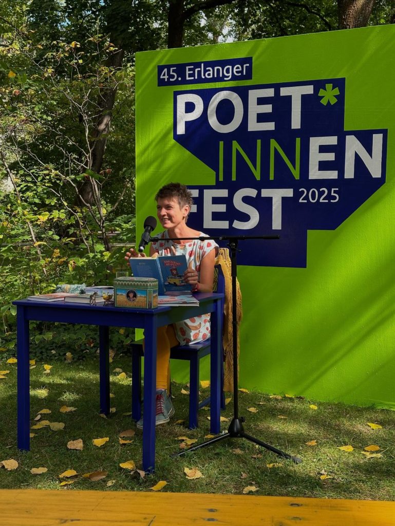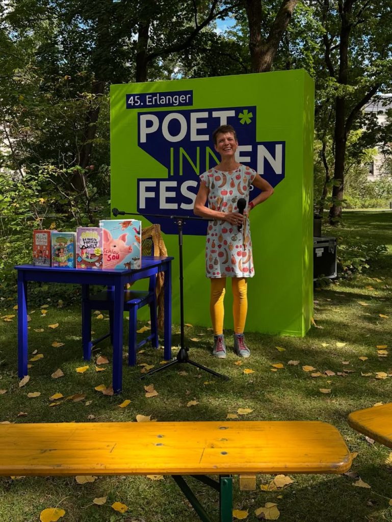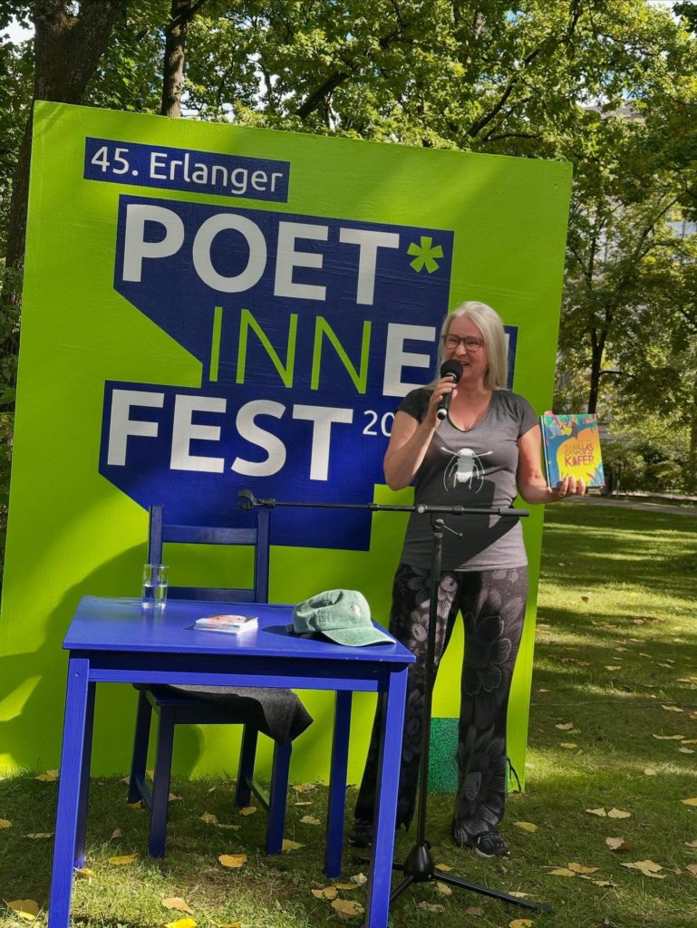 … auf dem Poet.innenfest in Erlangen! Das Wetter war perfekt und das Publikum ganz zauberhaft. Nicht nur bei meiner „Knäckebrothelden“-Lesung. Auch bei meinen Kolleginnen und Kollegen. Und mit Anne Jaspersen, die extra aus Hamburg gekommen ist und mit ihrem nagelneuen Buch eine tolle, krabbelig -käferige Weltpremiere hatte, hab ich es mir dann auch noch hinterher, bei einem leuchtenden Getränk, ein wenig gut gehen lassen. Danke an das Poet.innenfest für die Einladung und die tolle Orga. Ein richtig tolles Lesefest ist das! (Und wenn nicht gerade Schienenersatzverkehr herrscht, wie am Veranstaltungstag, von mir aus auch mit dem Zug fast mit einem Hops zu erreichen.)