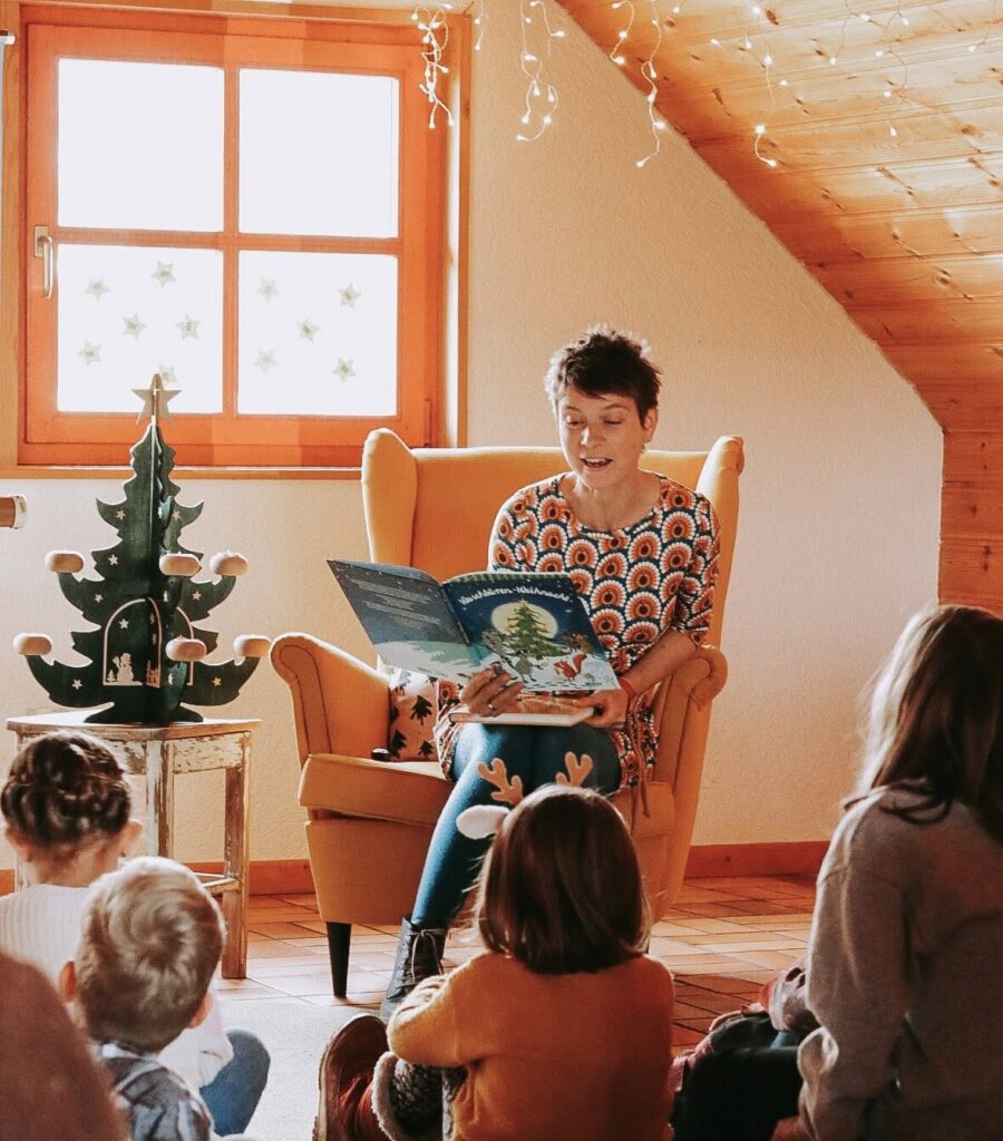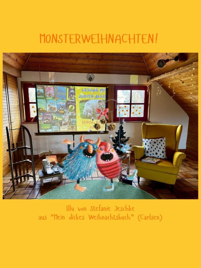 Gestern hatte ich die kürzeste Lesereise meiner Autorinnenlaufbahn (also abgesehen von Lesungen bei uns auf dem Hof): Eine Weihnachtslesung im Nachbardorf – und das mit 50 Kindern! Aber das war nicht mein Verdienst, sondern der dieser unglaublich beeindruckenden Dorfgemeinschaft Rossach (von der sind auch die schönen Fotos!). Die Truppe stellt gemeinsam so viele tolle Veranstaltungen auf die Beine, dass die Leute schon längst wissen, dass sich ein Besuch allemal lohnt. Während ich der einen Gruppe (monster- und waschbärweihnachtlich) vorgelesen und vorgesungen (!!!!) habe, durfte die andere gemütlich basteln. Plätzchen und Kuchen gab es auch noch. Und nen grooooßen Büchertisch mitsamt Signierstunde.