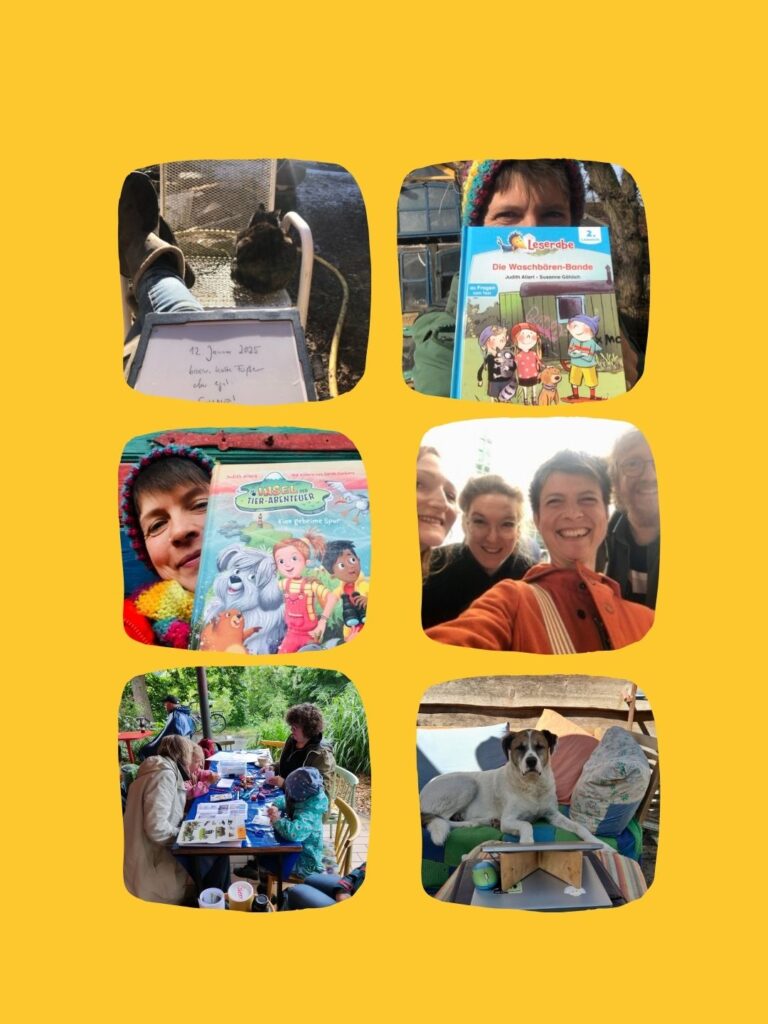 Zehn Jahre – ein Augenzwinkern! So einige Abschiede gab es seitdem. Tierische, menschliche … Und auch meine Bücher von damals wurden längst durch Neue ersetzt. Diese allumfassende Geschwindkiet hat mich eine Weile lang schon etwas fertig gemacht. Aber – es geht weiter! Neue Familienmitglieder, neue Geschichten, immer wieder etwas Buntes … Ich bin jedenfalls sehr, sehr froh immer noch sagen zu können, dass ich genau das mache, was ich liebe. Dazu gehört die Kinderbuchschreiberei mitsamt den wunderbaren Kinderbuchmenschen genauso wie mein tierisch tolles Landei-Leben. Und in Zukunft wird letzteres nochmal, dank „Gut Pusteblume“ vielmehr als sowieso schon mit ersterem kombiniert – ich freu mich wirklich riesig drauf!