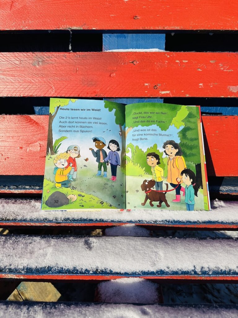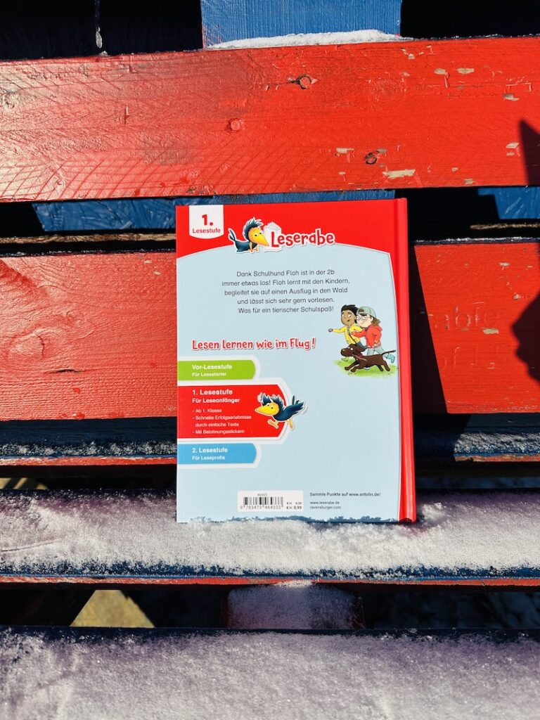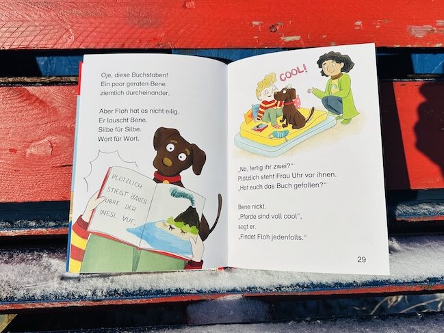 Also gut, der Schnee und die leuchtende, blendende Sonne sind von vorvorvorvorgestern. Aber dieses wunderhübsche Buch ist nigelnagelneu und ich freu mich riesig darüber! Die Illus von Sandy Thißen soooooo schön, oder? Und die kleinen Geschichten rund um Schulhund Floh und seine Klasse 2b mag ich auch sehr. Ich lieb’s ja, Erstleser zu schreiben. Die Herausforderung auf so wenig Zeilen und in so kurze Sätze eine Geschichte unterzubringen, die lustig und ein bisschen spannend ist, sich fluffig liest und auch noch mindestens ein bisschen Mehrwert in sich trägt – so ein Getüftel macht mir sehr viel Spaß. Ja und wenn dann noch ein Hund dabei ist …